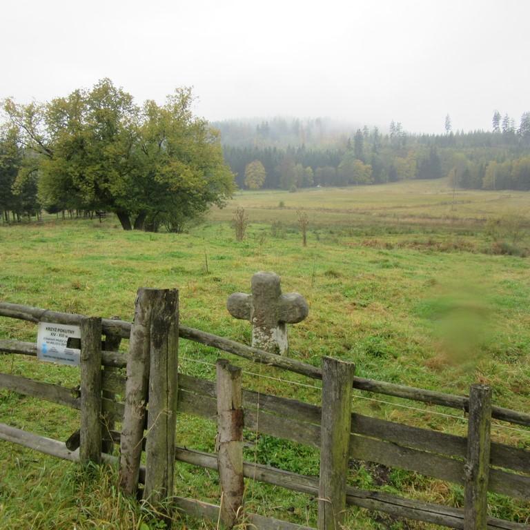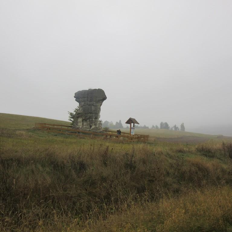 Po zwiedzaniu Lubawki na nocleg poszliśmy do schroniska młodzieżowego. Drugi dzień wędrówki przywitał nas, jak to jesienią często bywa, lekką mżawką. Na przekór pogodzie nam dopisywały wyśmienite humory. Ruszyliśmy do Krzeszowa. Tutejsze opactwo cysterskie zwiedziliśmy podczas innej wycieczki, więc teraz wstąpiliśmy tylko po pieczątki do książeczek turystycznych. Zatrzymaliśmy się za to w Gorzeszowie, bowiem przy drodze dumnie pręży się pomnikowy piaskowiec zwany Czarcią Maczugą. Wystarczyło poświęcić jej kilka fotek i powędrowaliśmy do Kochanowa. Główną atrakcją wsi jest stojący w urokliwym miejscu, nad niedużym stawem, średniowieczny kamienny stół sędziowski. Z tablicy informacyjnej dowiedzieliśmy się, że odbywały się przy nim wiejskie i kościelne rozprawy sądowe.