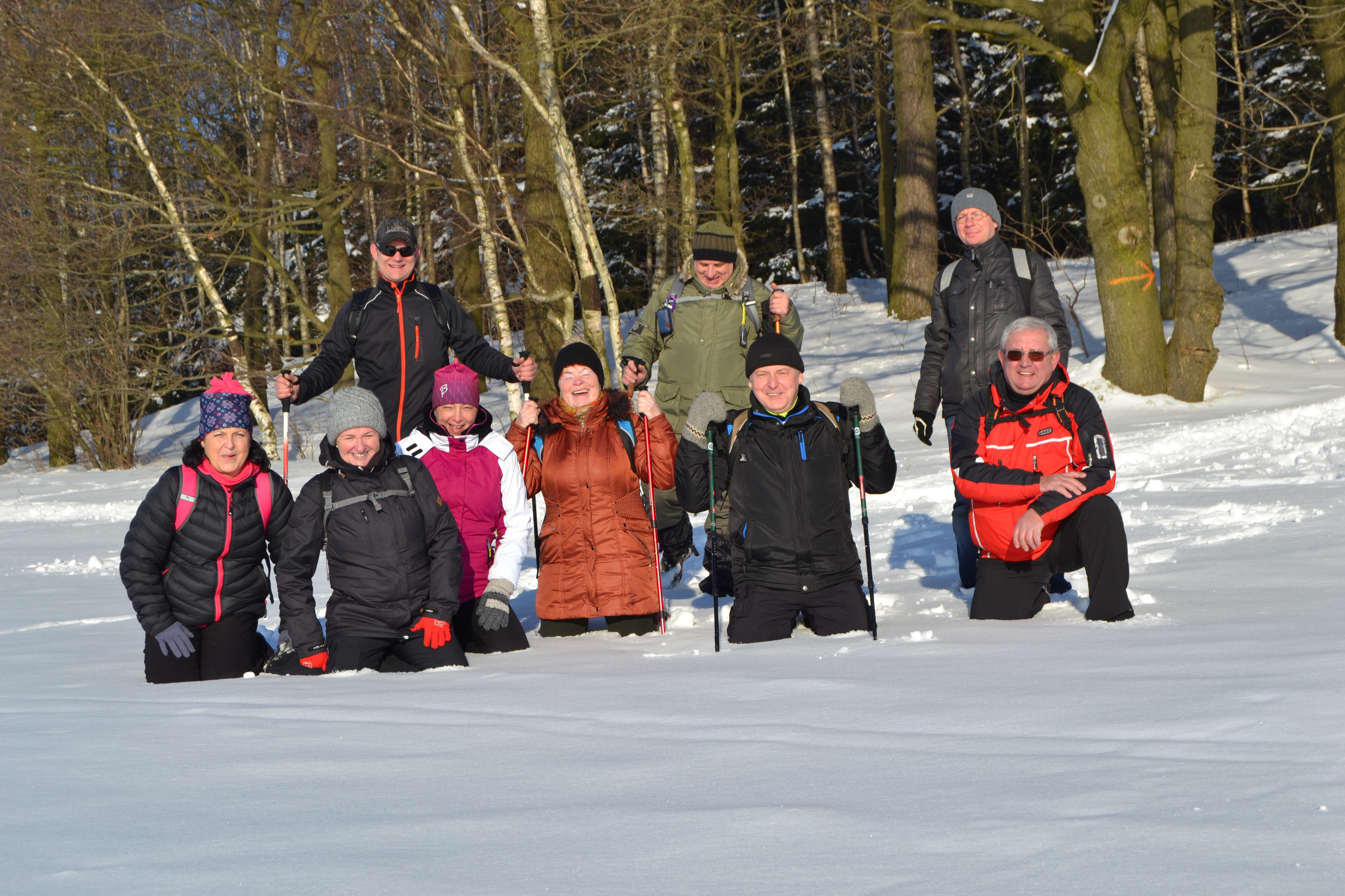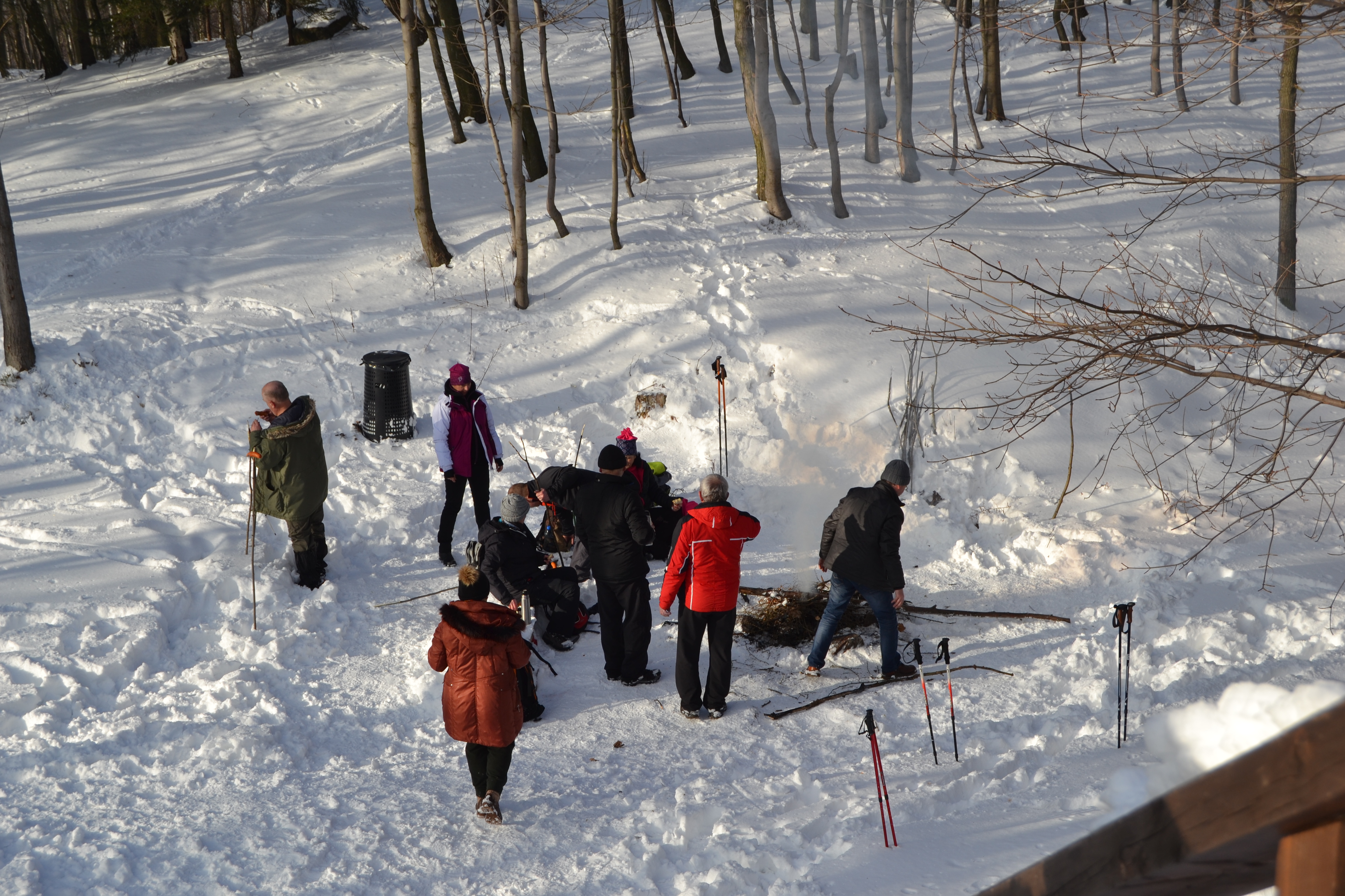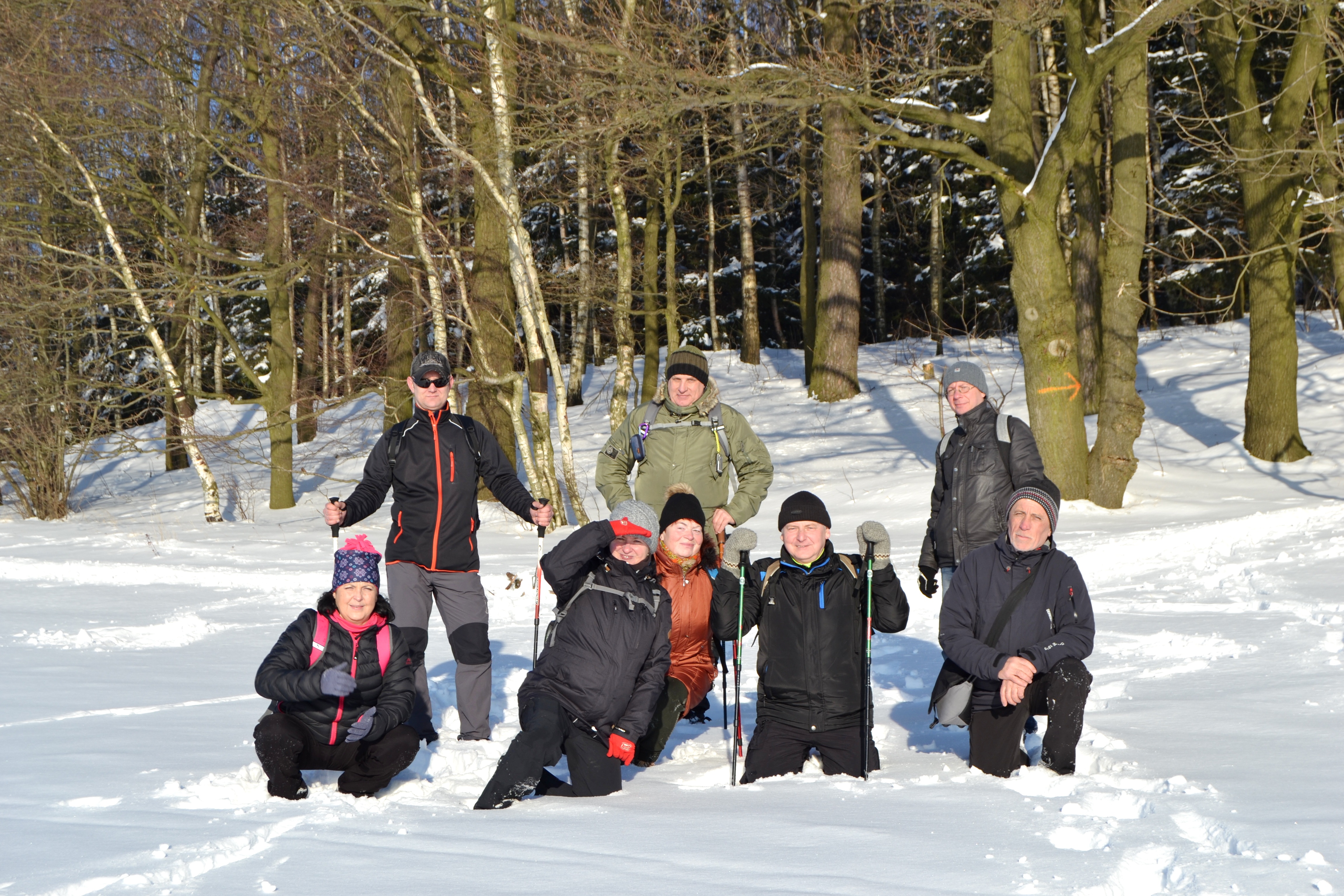 Pogoda wyjątkowa, piękna, słońce, śnieg, śmiech i zabawa to główny wątek wycieczki. Tuż za starą „sztachetówą” w Markocicach skręcamy w prawo i prościutko do lasu, na rozwidleniu znowu w prawo i jesteśmy w Jasnej Górze. Trzeba przyznać że postawione (przez wolontariat KWB Turów „Pomagamy”) znaki doskonale wskazują drogę. Przystanek tuż przy pomniku poległych żołnierzy, jest ławeczka i spotykamy innych wędrujących, można zagadać. Tak naprawdę to Jasna Góra pokazuje się z dobrej perspektywy turystycznej. Były z nami osoby, które nie widziały tak pięknych widoków. Tradycja mówi że na zakończenie należy zjeść przy wspólnym stole, tego niestety brakuje w Jasnej Górze ale ognisko na Guślarzu nam się udało i nikt nie wracał głodny. Ostatnia lipa opisana, zadanie wykonane, nasza radość nie do opisania.
