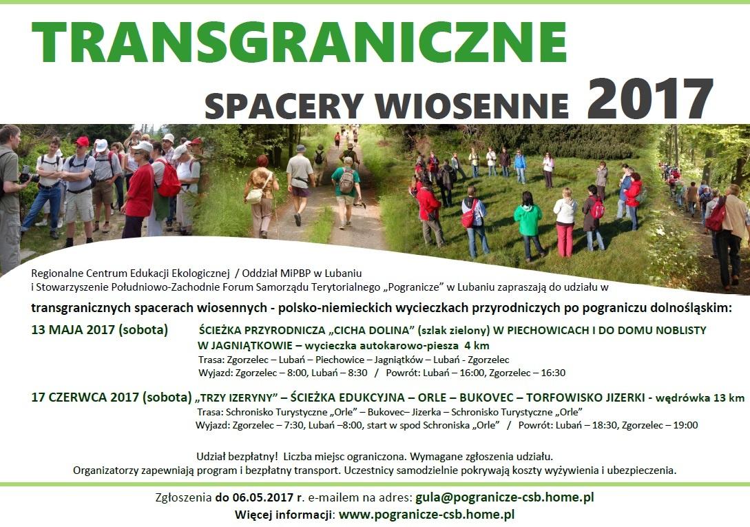W ramach tegorocznej XII edycji, organizatorzy zapraszają mieszkańców regionu, a w szczególności Lubania i powiatu lubańskiego oraz Saksonii, na 2 spacery. Trasa pierwszego (z doajzdem autokarem), zaplanowanego na 13 maja 2017 r., powiedzie ścieżką przyrodniczą Cicha Dolina w Piechowicach do domu noblisty Gerharta Hautpmanna w Jagniątkowie.