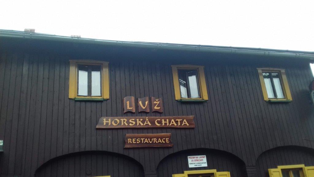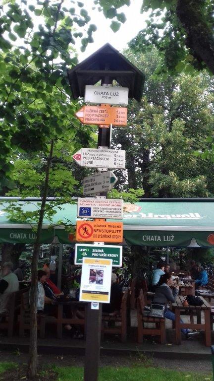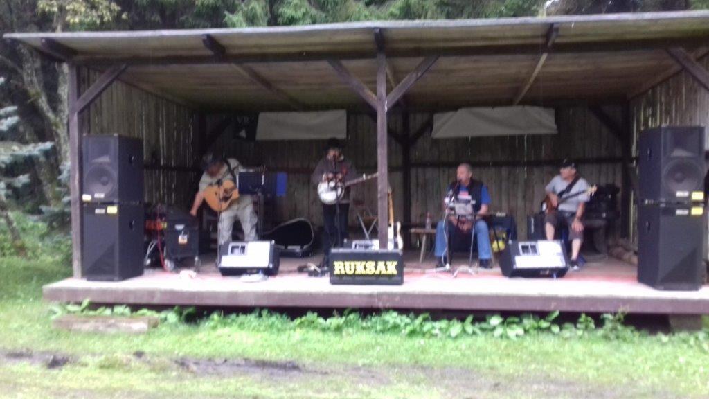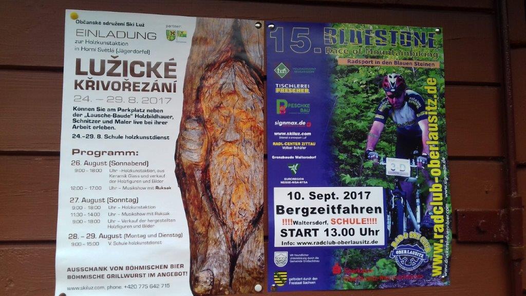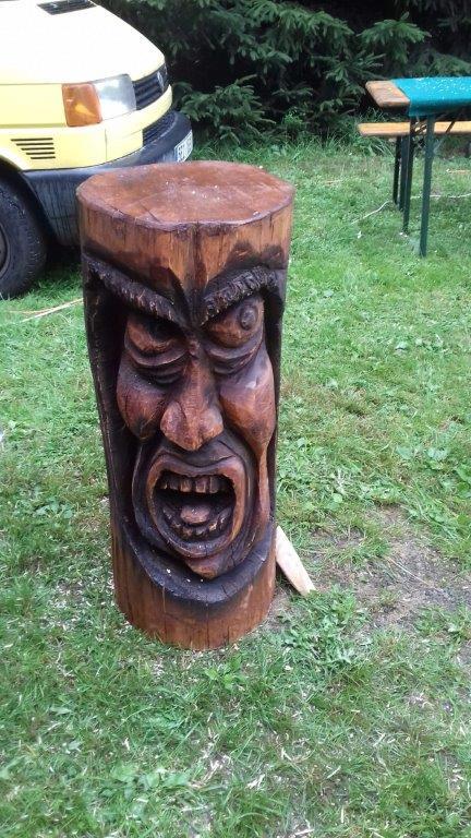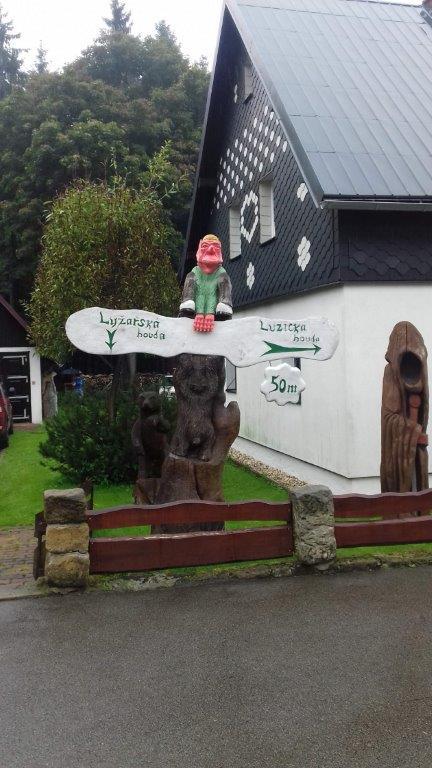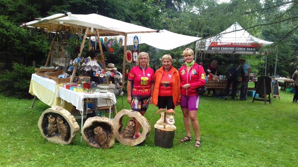 Do Myslivny mamy ok. 5 km a na dodatek spadł rzęsisty deszcz, dobrze iż jedziemy w lesie więc drzewa tworzą taką naturalną ochronę. Po dojechaniu, szybko chronimy się pod parasolami, dalej leje. Jak na razie ludzi niewiele, widzimy iż dojeżdżają nowi rowerzyści i dochodzą piesi z pobliskich Niemiec. Na polanie ok. 660 m n.p.m. trwa rywalizacja w rzeźbieniu, dla nielicznej publiczności gra kapela „Rusak”. Przyglądamy się jakie cuda wykonują, piłami spalinowymi w drewnianych klocach, przy niektórych, ceny w koronach lub euro. Uzupełniamy płyny oraz posilamy się przed powrotem do domu. Pogoda poprawia się, nie pada i nawet wychodzi słońce.
