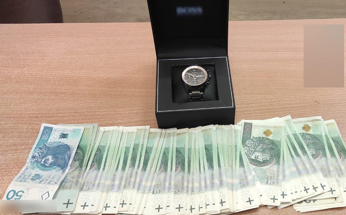 Na zdjęciu zegarek w pudełku i banknoty, fot. KPP w Zgorzelcu