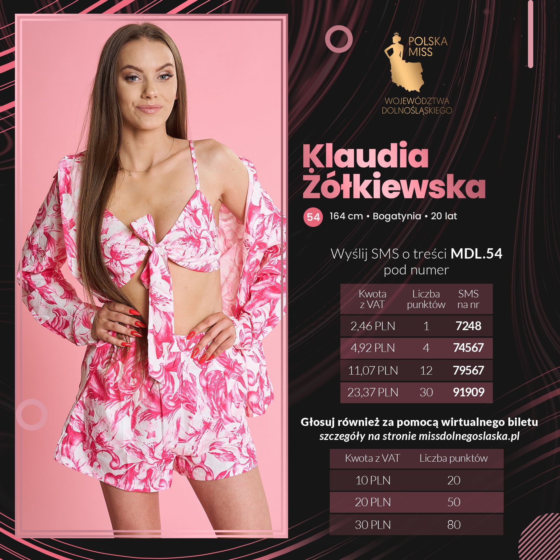 Klaudia Żułkiewska ma 20 lat i 164 cm wzrostu. Pochodzi z Bogatyni.