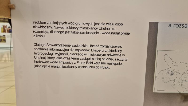 - Problem zanikających wód gruntowych jest dla wielu osób niewidoczny. Nawet niektórzy mieszkańcy Uhelna nie rozumieją, dlaczego jest takie zamieszanie - woda nadal płynie z kranu. Dlatego Stowarzyszenie sąsiedzkie Uhelná zorganizowało spotkanie informacyjne dla sąsiadów. Eksperci z dziedziny hydrogeologii wyjaśnili, dlaczego w miejscowym odwiercie w Uhelnej, który jakiś czas temu zastąpił suchą studnię, zaczyna brakować wody. Prawnicy z Frank Bold wyjaśnili następnie, jakie opcje mają mieszkańcy w stosunku do Polski - możemy przeczytać na jednej z plansz. Tekst opisów zdjęć prezentowano w języku czeskim i polskim.