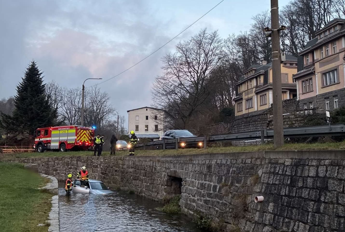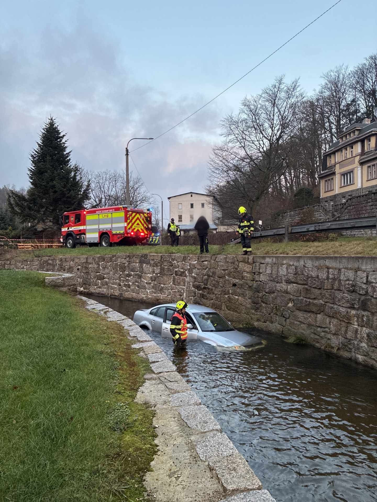 Na miejsce natychmiast wezwano straż pożarną. Rzeczniczka strażaków, Jaroslava Benešová, poinformowała, że konieczne było użycie specjalistycznego samochodu ratownictwa technicznego, sprowadzonego od strażaków kolejowych, aby wydobyć auto z nurtu wody.