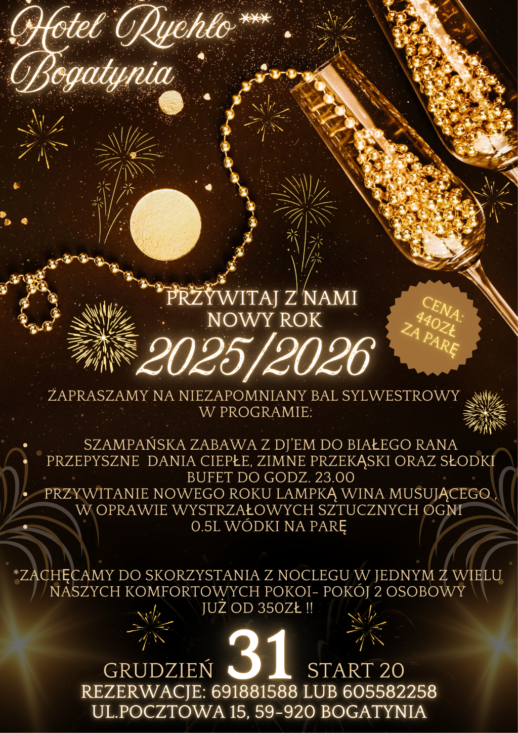 Szukasz idealnego miejsca, aby hucznie pożegnać stary rok i z rozmachem wejść w 2026? Hotel Rychło w Bogatyni zaprasza na niezapomniany Bal Sylwestrowy, który połączy elegancję, wyśmienitą kuchnię i zabawę do białego rana!