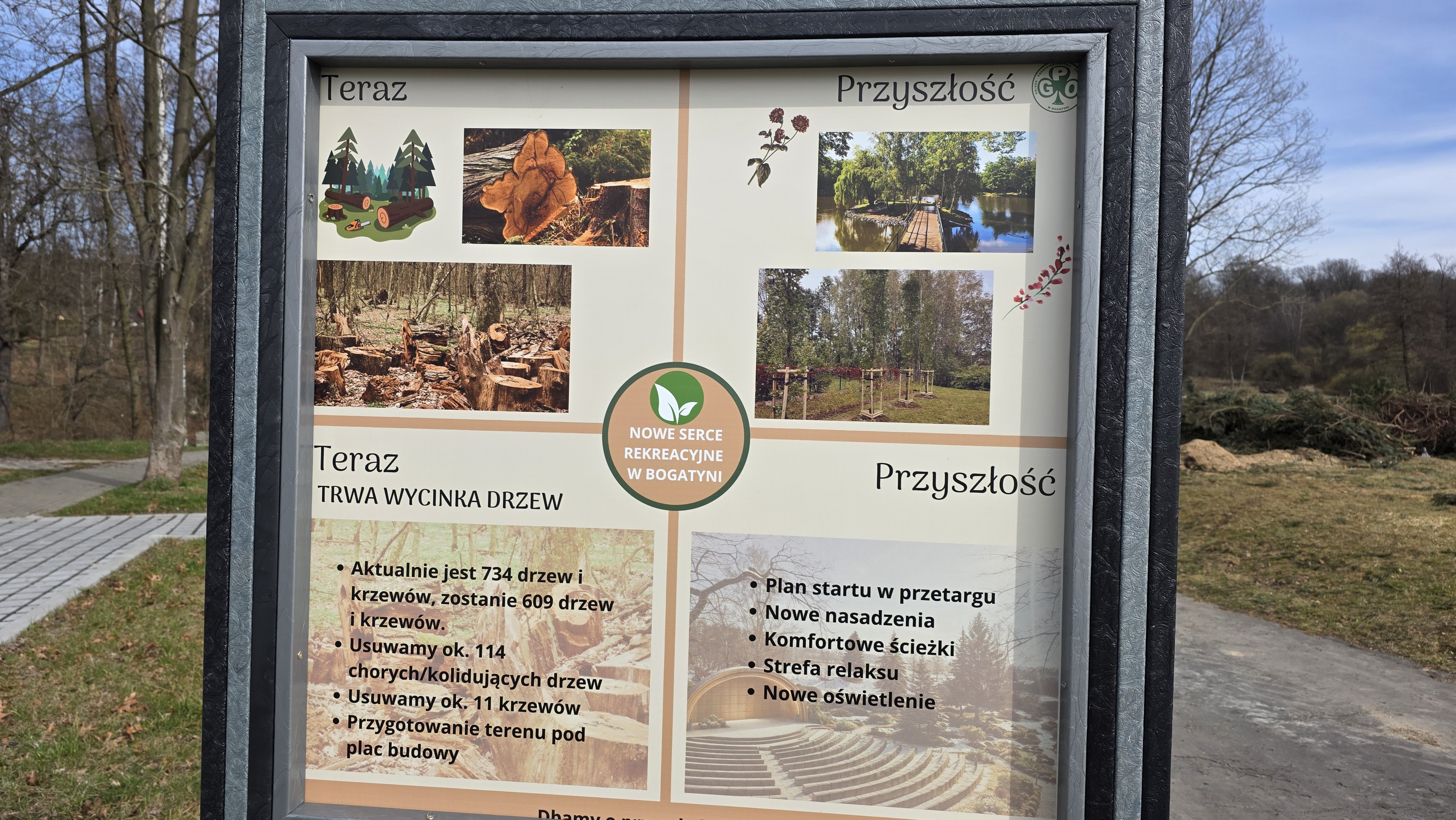 W rejonie ulicy Kąpielowej w Bogatyni trwają intensywne prace, które wywołały spore poruszenie wśród mieszkańców zaniepokojonych widokiem wyciętych pni. W odpowiedzi na te głosy, przy jednej ze ścieżek stanęła specjalna tablica informacyjna zatytułowana „Nowe Serce Rekreacyjne w Bogatyni”, na której urzędnicy szczegółowo tłumaczą się z prowadzonych działań.