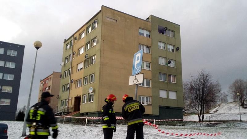 W bloku przy ulicy Chopina elewacja jednej ze ściany bloku może się oderwać. Na miejscu pracują strażacy.